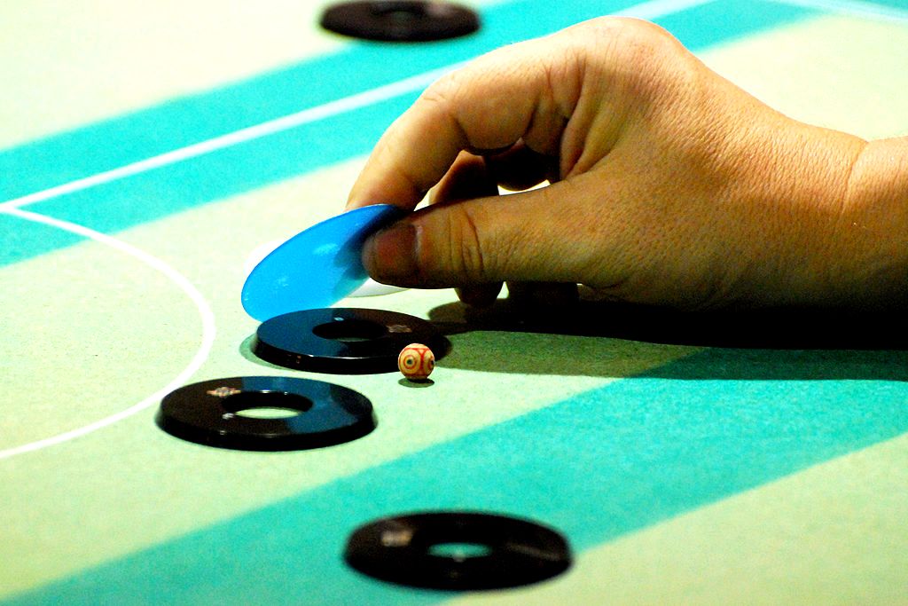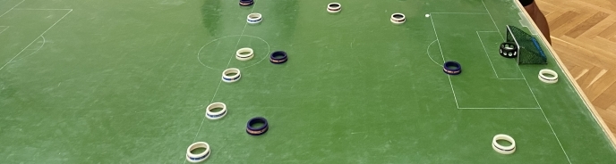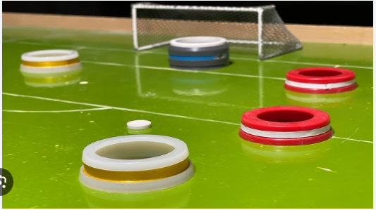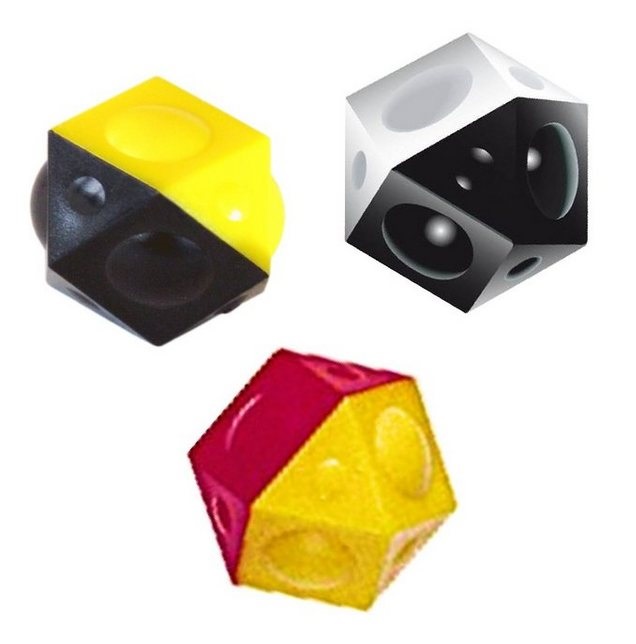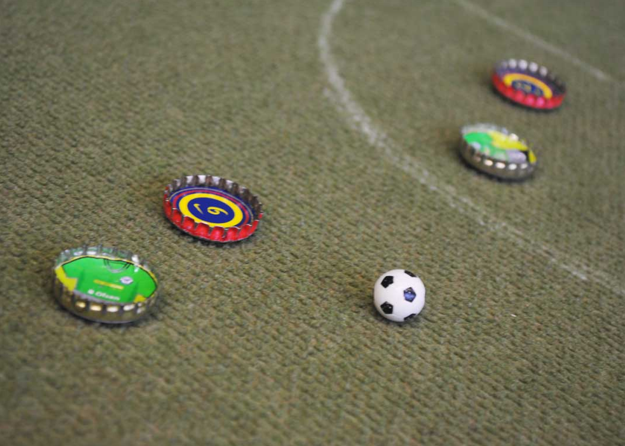Frei beweglicher Ball. Quadrat Würfel oder Scheiben (Disc wie Eishockey) oder Knöpfe.