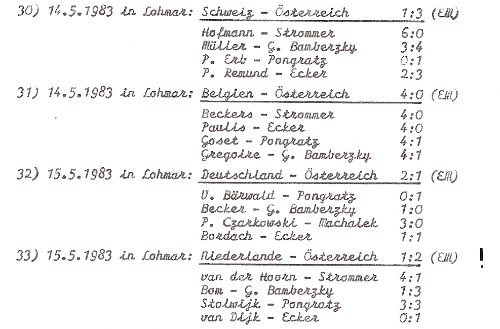1983, der EÖTV ist 10 Jahre jung. Es war der ETF Nationen Europa Pokal in Lohmar, Deutschland, wo man die erste Nationalmannschftsmedaille des EÖTV per PKW nach Hause transportierte. Das war Schwermetall in Sachen Bronze. Ebenfalls wurde ein Paar Monate zuvor die erste Einzelmedaille durch Gerhard Ecker beim ETF  Europa Pokal errungen. Doppelter Erfolg für den EÖTV zum Jubiläum. Grandios.