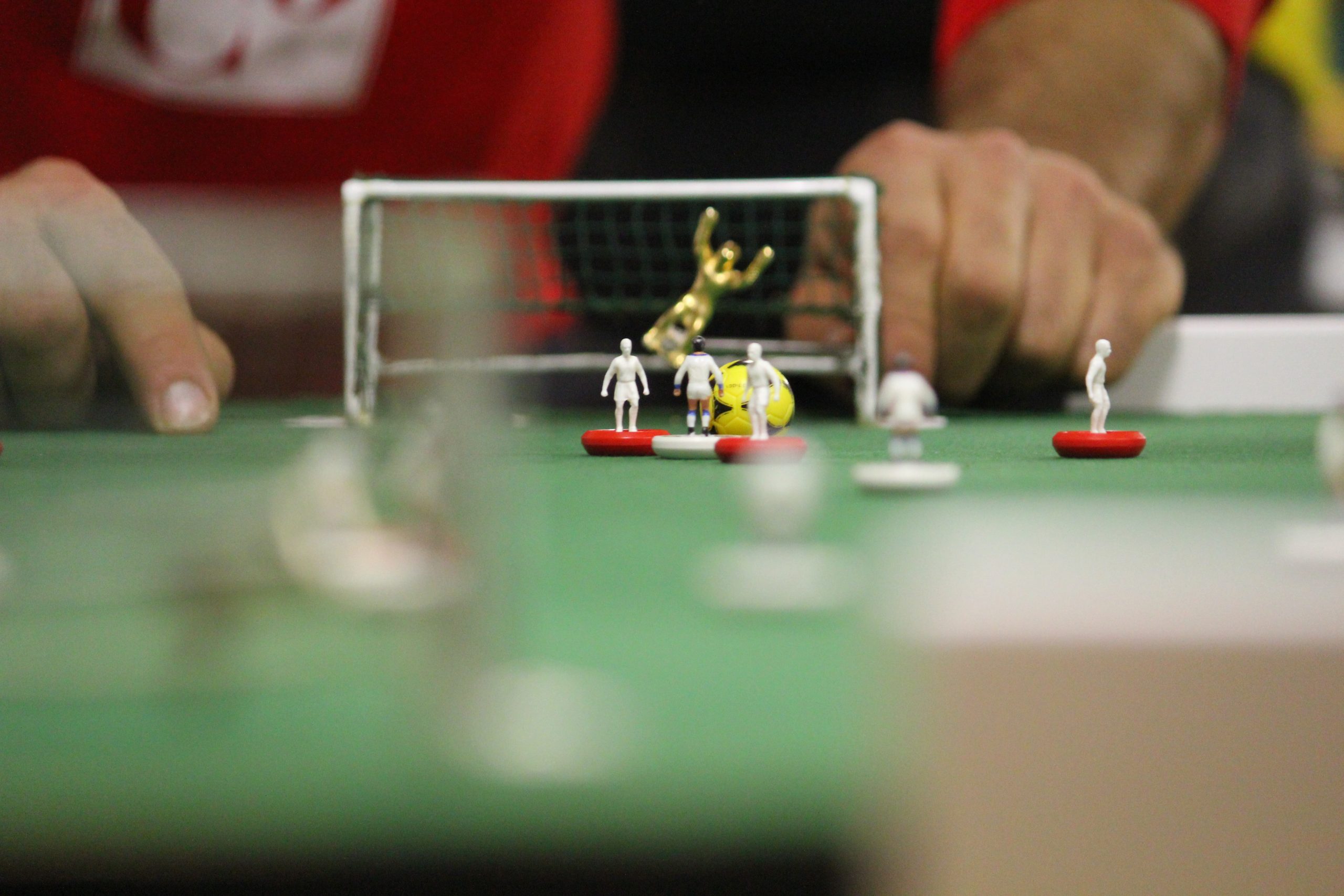 1950s The first sets were made up of two cardboard team sheets with printed players (which needed to be cut out), 20 small plastic bases for the outfield players, and two rectangular brown bases for the goalkeepers (with metal rods for control). The goal frames were assembled from metal wire (the crossbars were a separate piece), and the goal was finished with a cardboard net. Players were also given a piece of chalk to keep the score.