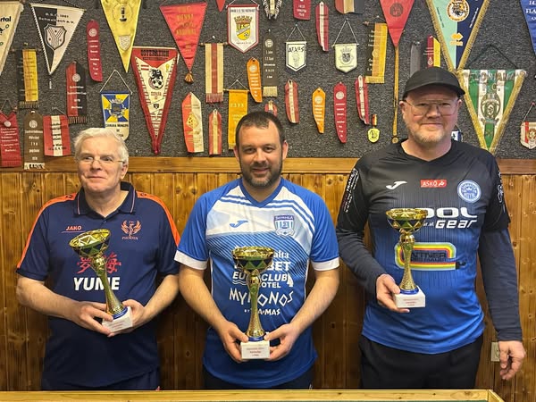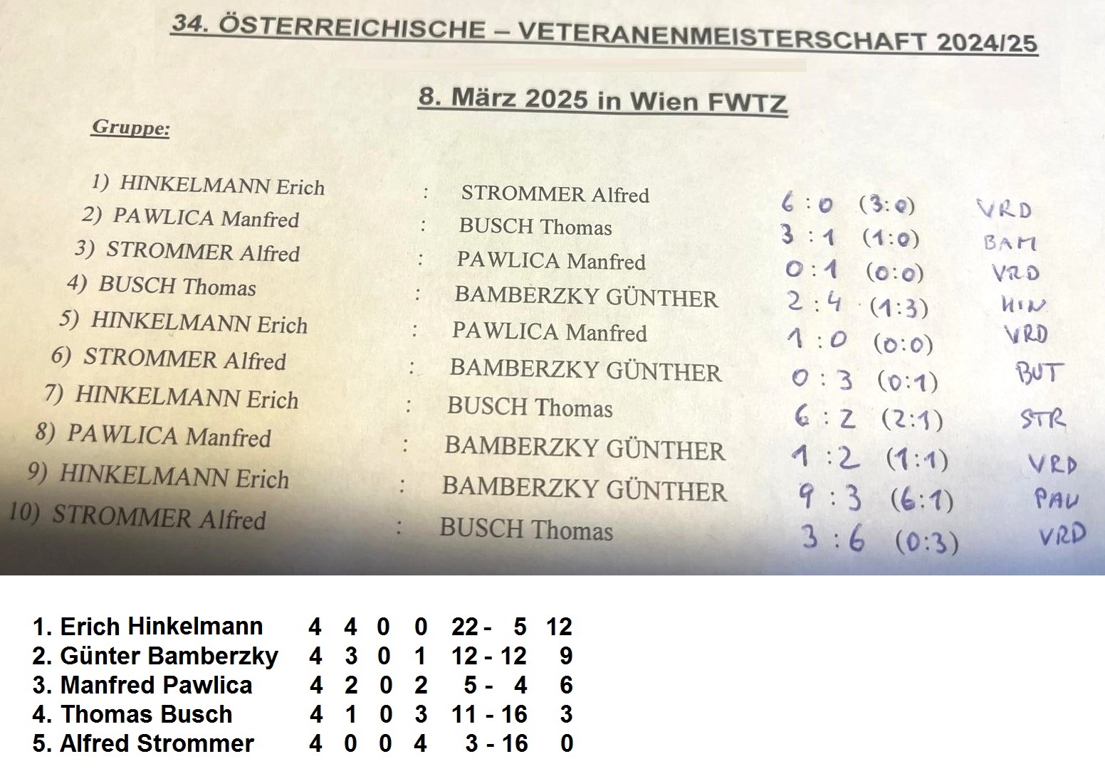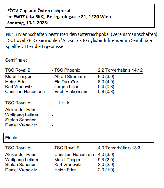Die EÖTV Veteranen Meisterschaft fand am Samstag 8. März 2025 in Wien Kaisermühlen statt. Das FWTZ war wie 2024 das  Spiellokal. Insgesamt kamen 5 begeisterte Veteranen, um sich zu messen. Der TSC Royal 78 Kaisermühlen sorgte in Person von Daniel Vranovitz für Speis und Trank sowie einen geordneten Ablauf, indem sich Daniel in allen fünf Spielzeiten als Schiedsrichter zur Verfügung stellte. Die einzelnen Spiele sorgten für spannende Begegnungen.