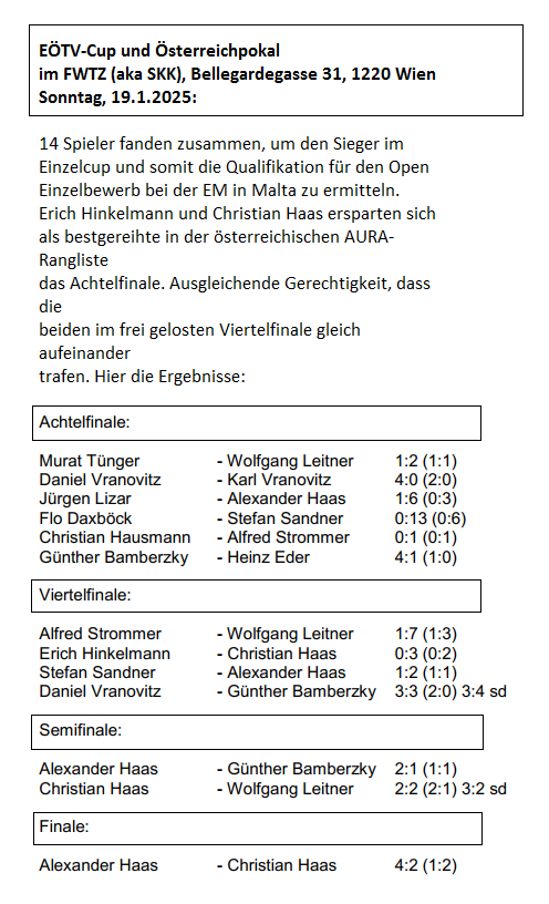 Die Österreichliga (Mannschaftsliga für Vereinsmannschaften) fand in Traiskirchen und nicht in Mattersburg am 15. Mai 2025, 19.15 Uhr statt. TSC Phoenix hatte eine zweite Mannschaft aufgestellt, sodaß wenigstens drei Mannschaften Teilnahmen. Sehr schade das der TFC Mattersburg letztendlich keine Mitglieder motivieren konnte um eine Mannschaft zusammenzustellen. Der EÖTV arbeitet intensiv daran Mitglieder zu werben um Vereine mit Mannschaften im kommenden Spieljahr 2025/26 aufzustellen. Die Österreichliga ist und war immer der beliebteste Bewerb des EÖTV.
