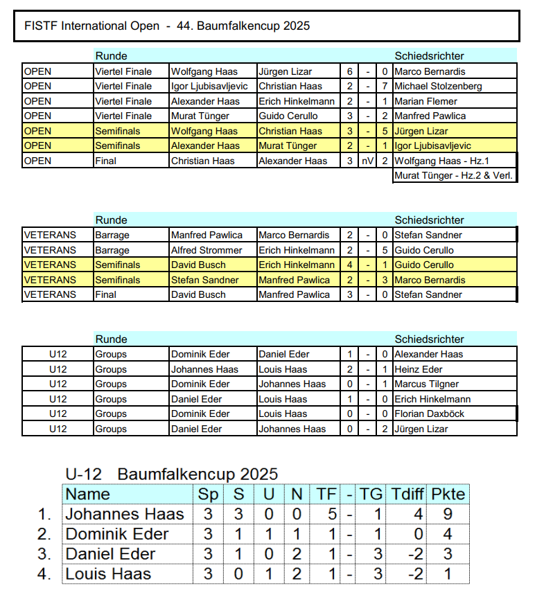 Anbei die wichtigsten Einzelbewerb Ergebnisse ab dem Viertel Finale  im Open & Veteranenbewerb. DIe U-12 spielten in einer Gruppe.