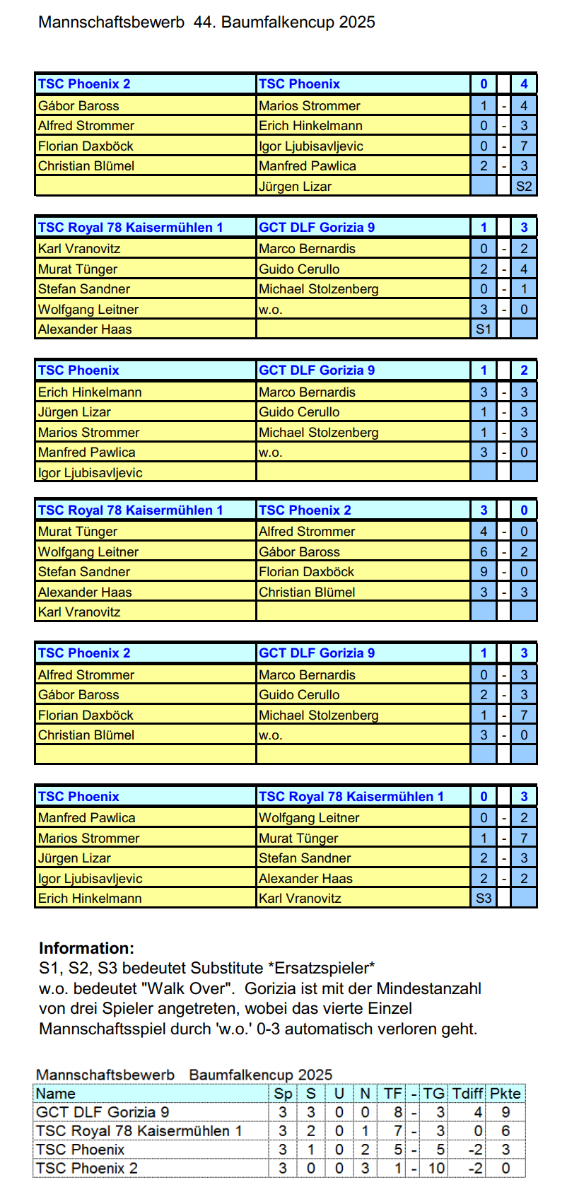Der Gastgeber TSC Phoenix veranstaltete das FISTF international Open. Der 44. Baumfalkencup  fand diesmal am  7. und 8. Juni 2025 statt. Spielort war wieder Traiskirchen.