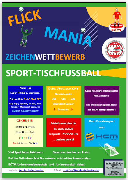 Der EÖTV organisiert einen Zeichenwettbwerb für jugendlcihe, die beim Spielefest sich für Tischfußball interessieren und/oder bei den einzelenen Anfängerturnieren teilnehmen. Wir suchen noch Jurymitglieder die die besten Zeichnungen aussuchen. Preise für die Teilnehmer werden benötigt und zwar für die Kategorien U12, U16 und U20. Die besten vier Zeichnungen je Kategorie erhalten Preise. Wir Bitten Euch alle um Unterstützung.