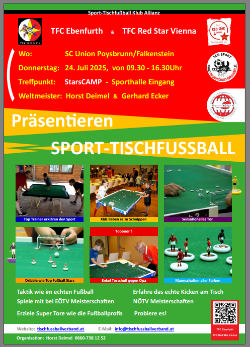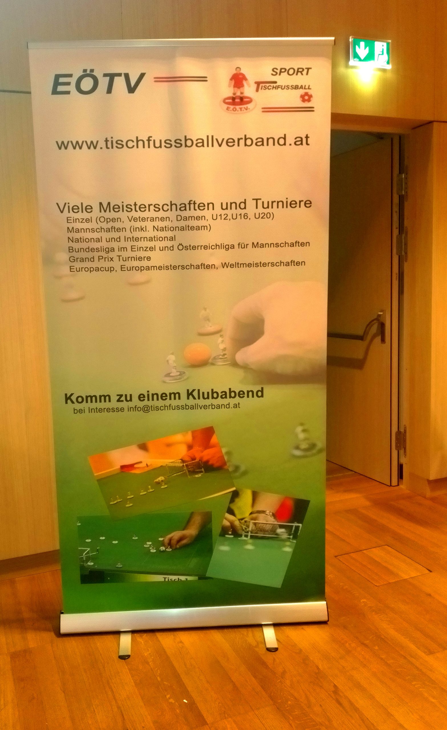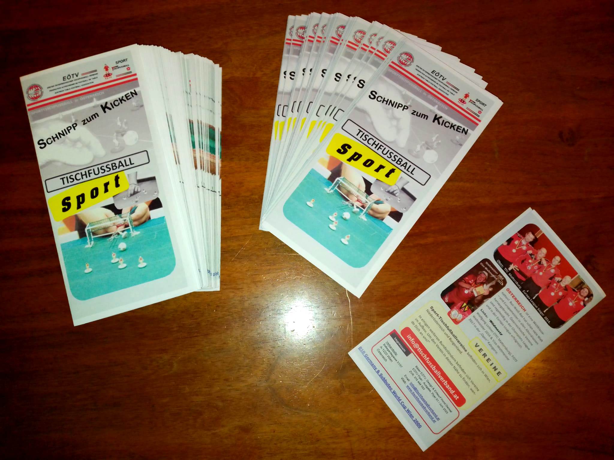 Unterstützt wird diese Veranstaltung durch den SC Union Poysbrunn/Falkenstein, dem unser Sport bereits vor einigen Wochen präsentiert worden war. Wir hoffen auf Erfolg in Poysbrunn, sodass jung und alt Schnippen und in Zukunft Turniere spielen. Nicht jeder kann Messi oder Ronaldo werden, ABER jeder kann Sport-Tischfußballer werden….und zur Champions League oder WM fahren. Also…auf zum Tischfußball Training mit den EÖTV Stars..