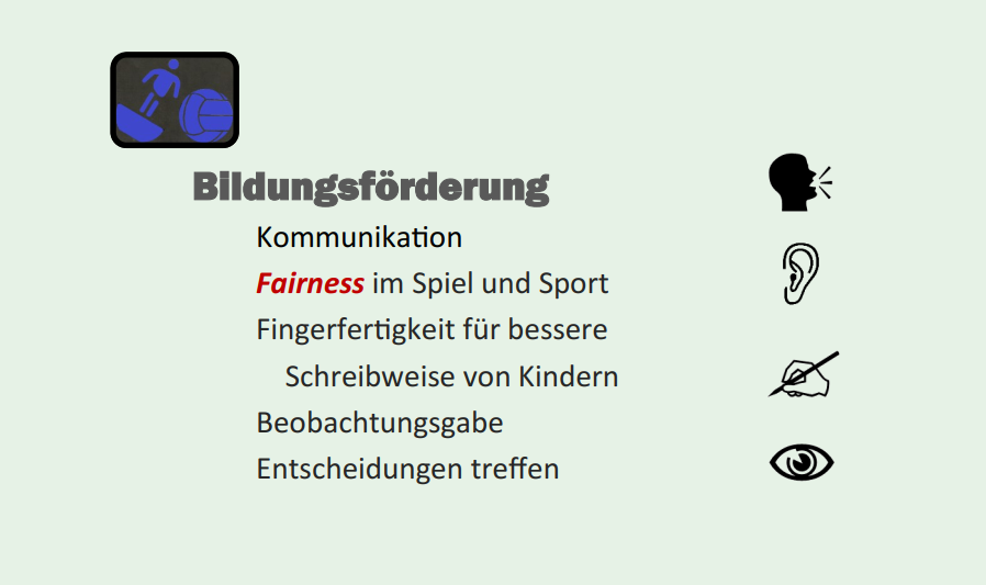 Sport-Tischfußball fördert die Kommunikation zwischen Schüler, weil die Spielregeln erlernt werden und während des Spieles die Situationen wie eine Eckball besprechen müßen. Der Schiedsrichter leitet das Spiel und trifft sachgerechte sportliche Entscheidungen.