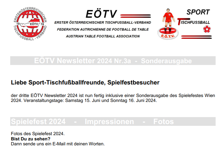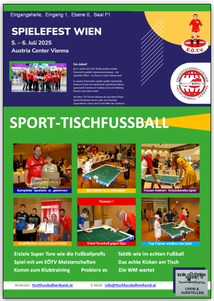 Der EÖTV plant auch 2026 wieder beim Spielefest dabei zu sein. Bitte plant den Termin in der ersten Juli Woche ein. Eine Terminbestätigung erfolögt durch den Veranstalter, Skilled Events. 2025 waren hervorragend aufgestellt und 2026 sol wir noch einen weiteren positiven Organisationsschritt machen. Es wäre ein riesen Vorteil, wenn wir mindestens 6-7 EÖTV Angels vor Ort hätten, und zwar Samstag und Sonntag jeweils Vormittag und Nachmittag. Interessenten, Kinder und Eltern haben unseren Stand überrannt und das bei vier Spielplatten. Diesen waren permanet besetzt.